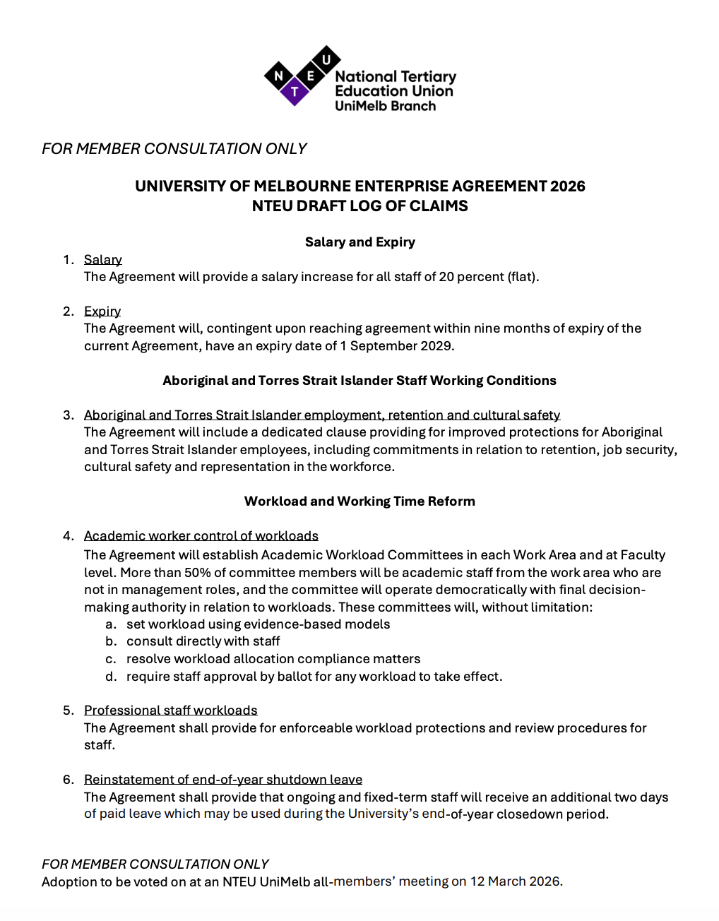 The NTEU University of Melbourne Branch Committee has shared its draft Log of Claims for a new Enterprise Agreement at the University.