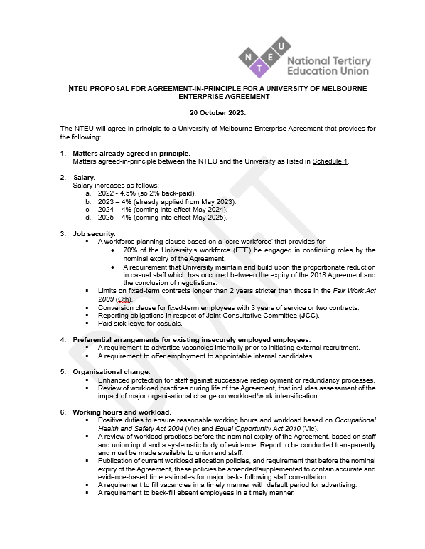 On 23 October 2023, NTEU shared a proposed package for membership endorsement to put to University of Melbourne management