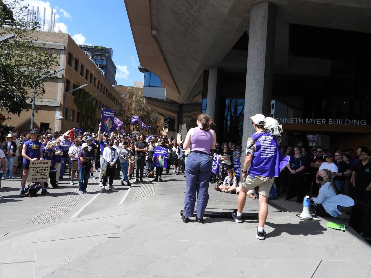 It was a glorious beginning to our week of strike action across the university! Hundreds of staff and students joined a strike-rally starting at South Lawn before marching to the Kenneth Myer Building where Duncan Maskell was visiting the Faculty of Science on the first stop of his “Vice Chancellor’s Roadshow.”
